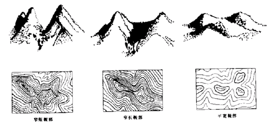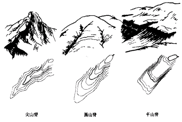 (3)山脊。从山顶到山脚凸起的部分,等高线特点是一组由山顶向山脚凸出,两侧对称的曲线,山脊按形状可分为尖山脊、圆山脊和平山脊。