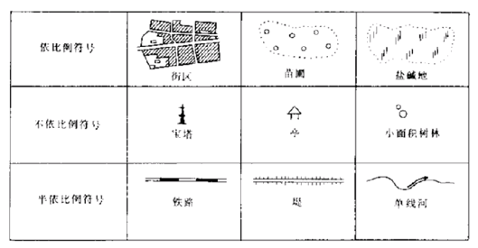 地形图内除地形符号(等高线)及注记外,所有符号统称地物符号。地面上的物体是错综复杂的,必须经过归纳(分类、分级)进行抽象,并用特定的符号表示在图上。