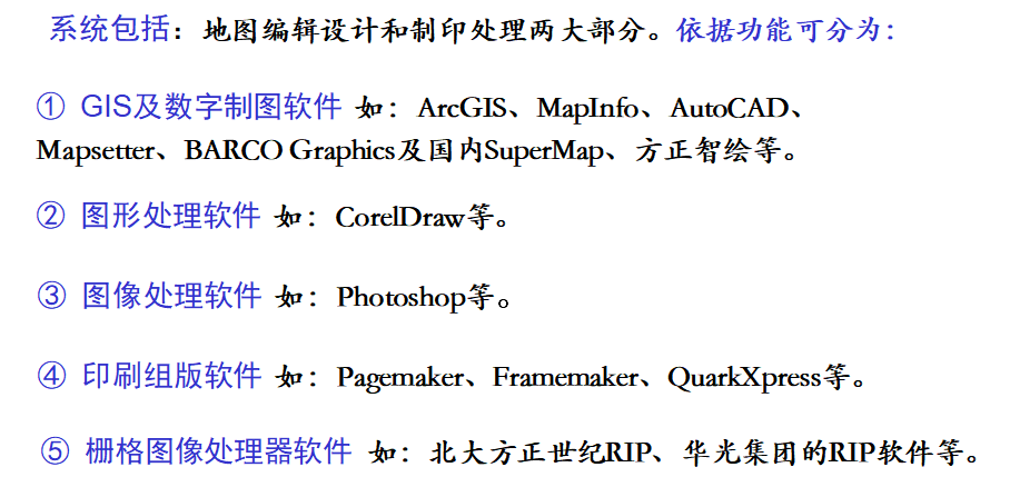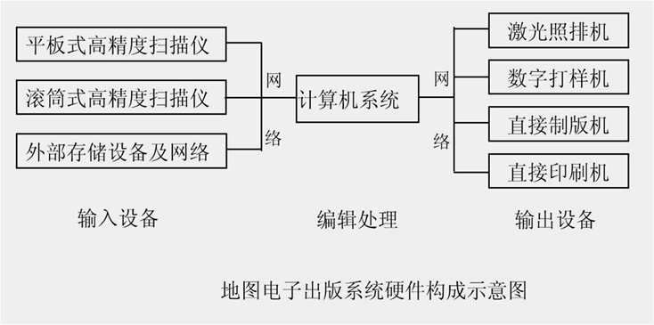 地图编辑制作涉及复杂的图形、图像处理,对计算机系统要求高,形成地图编辑工作站;需要有存储设备: 硬盘、磁盘阵列、光盘;通讯设备:数据传输网络设备。