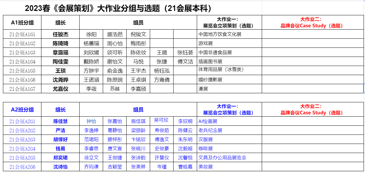 【腾讯在线共享文档】2023春《会展策划》大作业二分组选题讨论(21会展本科):https://docs.qq.com/sheet/DRERER0xNb2Flb05Q