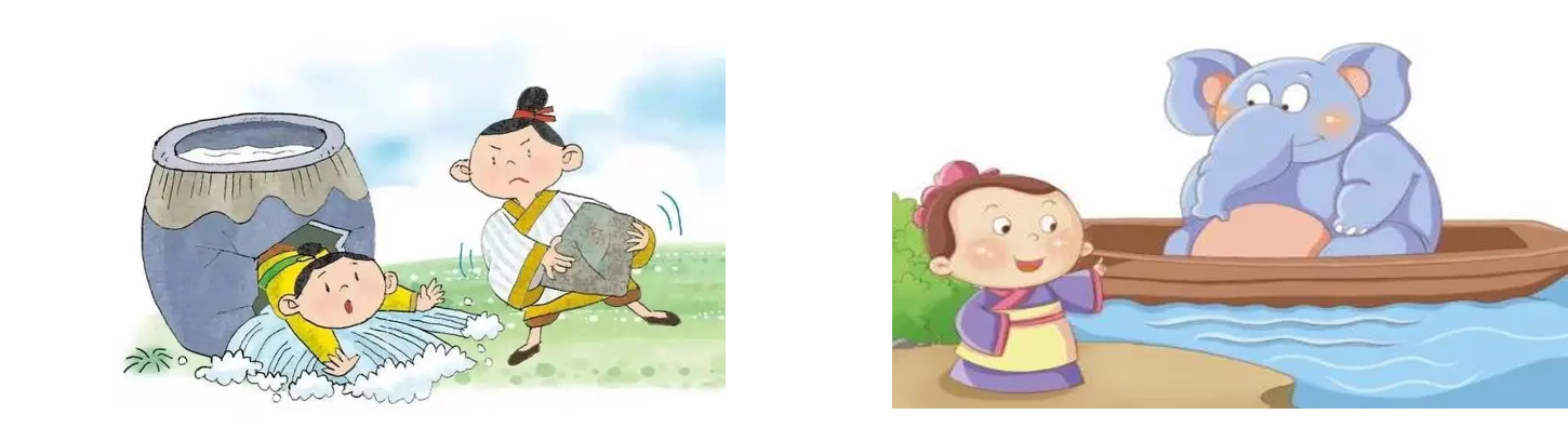曹冲长到五六岁的时候,知识和判断能力就如一个成年人一般。有一次,孙权送来了一头巨象,曹操想知道这象的重量,便询问他的属下这件事,但属下们都不能说出称象的办法。曹冲说:“把象放到大船上,在水面所达到的地方做上记号,再让船装载其它东西,称一下这些东西,那么比较下就能知道了。”曹操听了很高兴,马上对大象照这个办法做了。