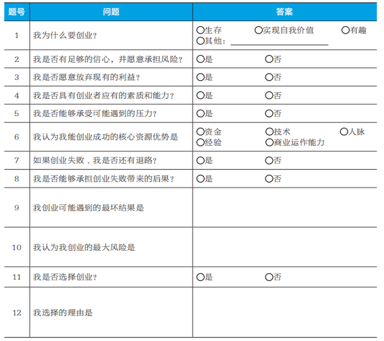回答下面 3 个问题,再根据表所示的内容,完成对自己的创业概率评估,由此分析创业是否能实现自己的愿望,以及自己创业的概率,确认自己对创业的想法。