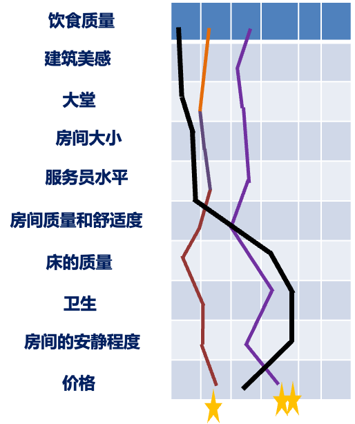 当时西方中产阶级兴起,中产阶级意味着白领啊,需要出差,住普通酒店感觉跟自己身份不符,住星级酒店感觉价格又太昂贵。于是出现了经济型快捷酒店。下面是酒店满足顾客需要的属性图。