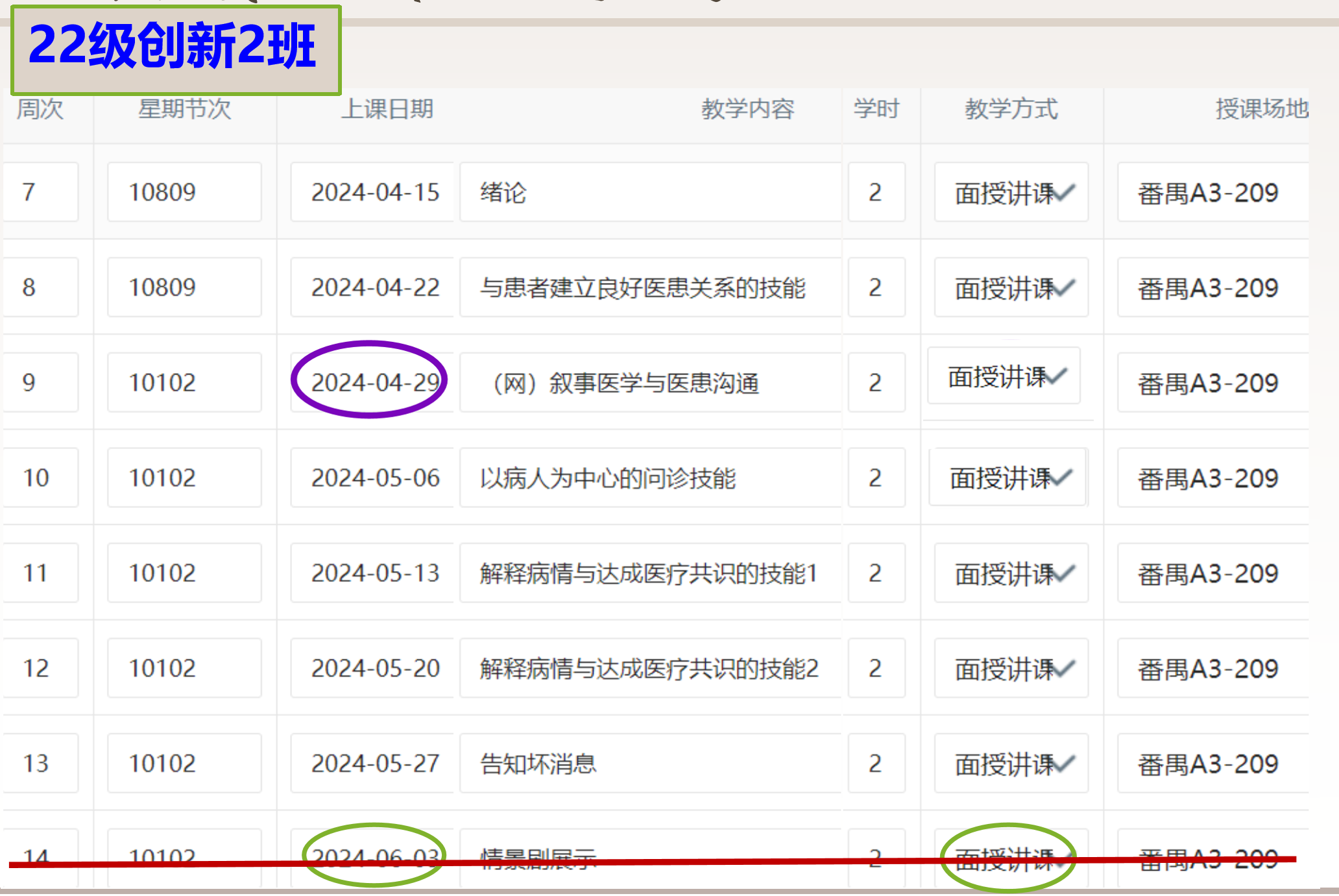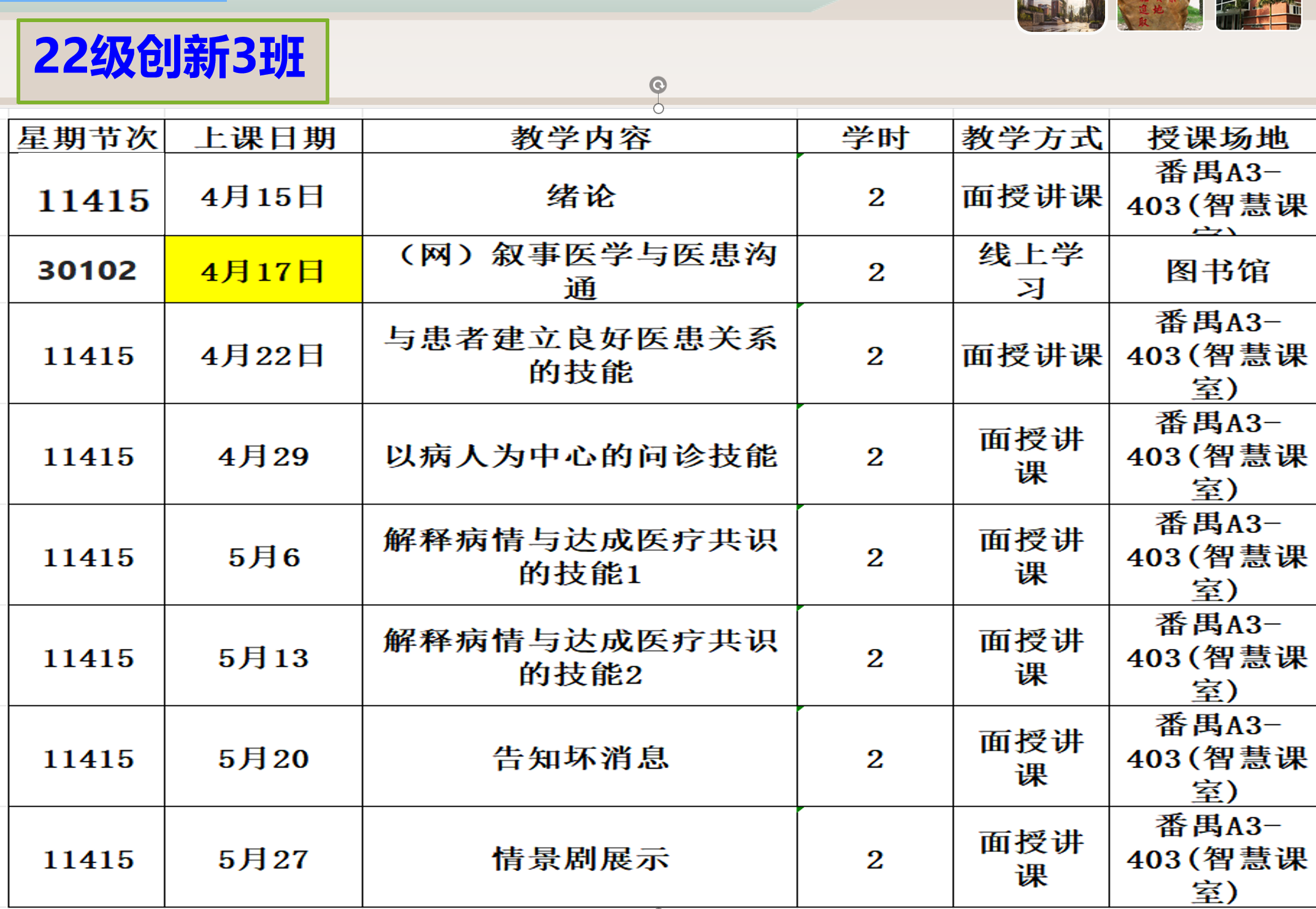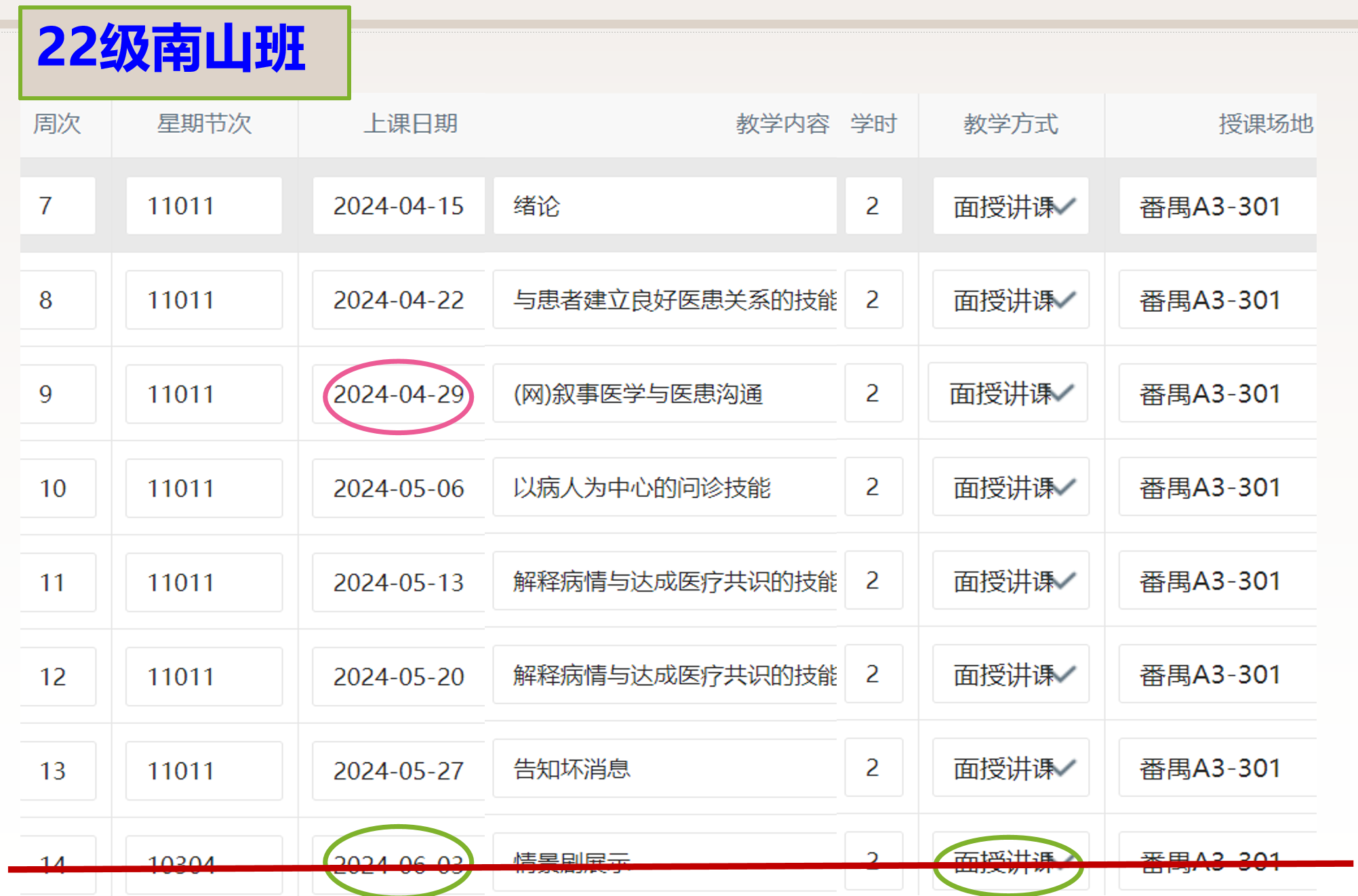 线上学习课程,不用去教室。但是由于收到临床三院教学办的通知,告知6月份为大家集中临床见习的时间,所以6月3日的课调到4月29日。教学内容按时间顺延。5月27日为我们的最后一次课,情景剧展示。时间比较紧张,希望大家能够提早查看情景剧拍摄与评分标准等,提前好相关时间规划。