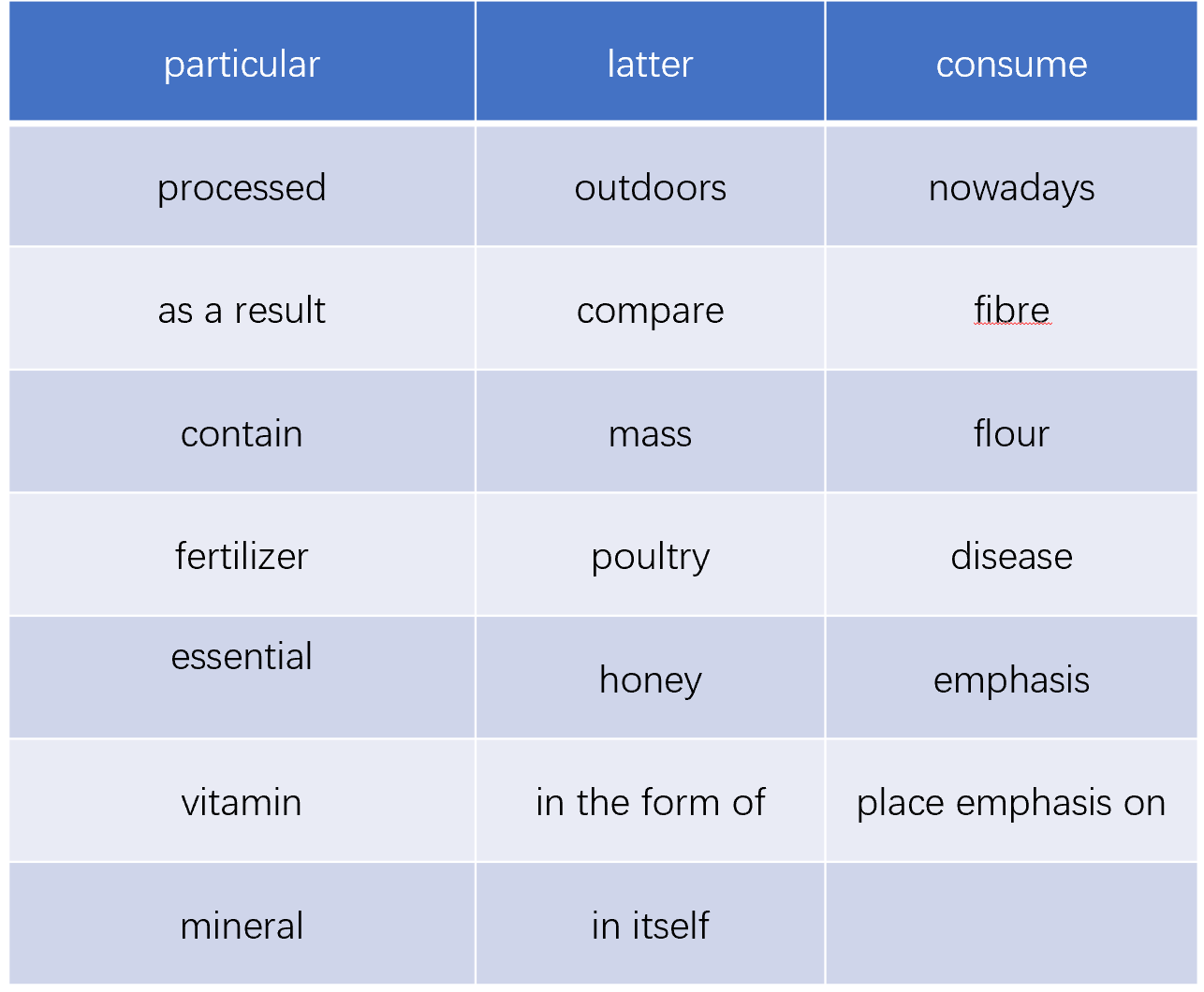 6 Nowadays fibre is considered to be an essential part of a healthy diet. A lot of fibre is found in unprocessed flour and in many vegetables. However, the fibre has been removed in foods like white bread. In some countries where the national diet contains large quantities of unrefined flour and vegetables, certain diseases are comparatively rare. That is why modern experts on“healthy eating”place a lot of emphasis on the eating of vegetables.