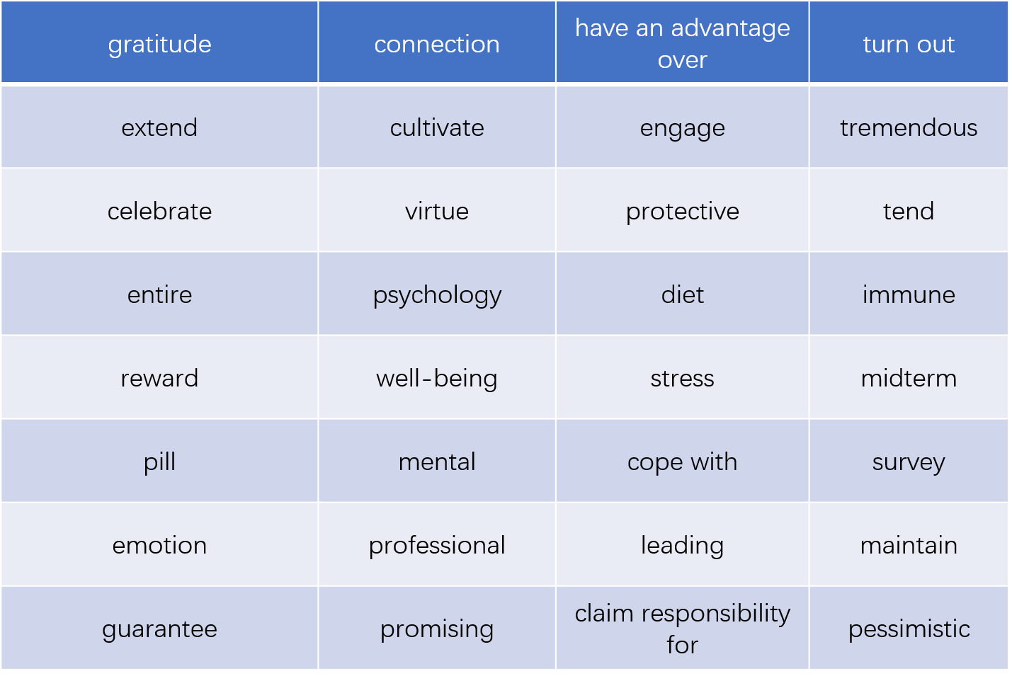 众所周知,压力会使我们生病,尤其是当压力大到我们应付不了的时候。压力还跟一些主要的死亡原因有关,包括心脏病和癌症,90%来看医生的人其疾病都是由压力造成的。研究结果证明,感恩能够帮助我们更好地处理压力。“感恩研究开始显示,感激的那种感觉对于帮助人们处理日常问题,尤其是压力,能产生巨大的积极影响。”埃蒙斯说。