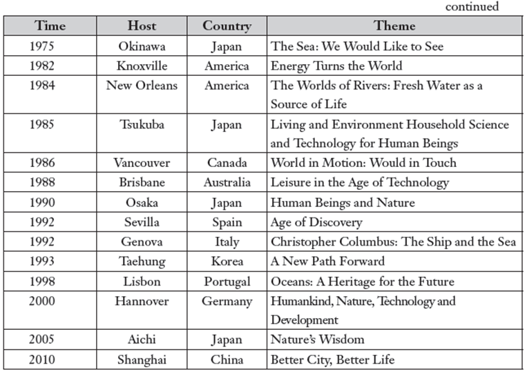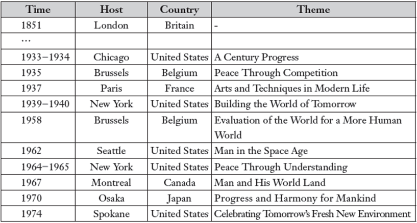 From the first World Expo held inLondon in 1851, the World Expos have been held successively for many years. In1933, World Expo Chicago set up its theme, and then the following expos alsohad their special themes.
