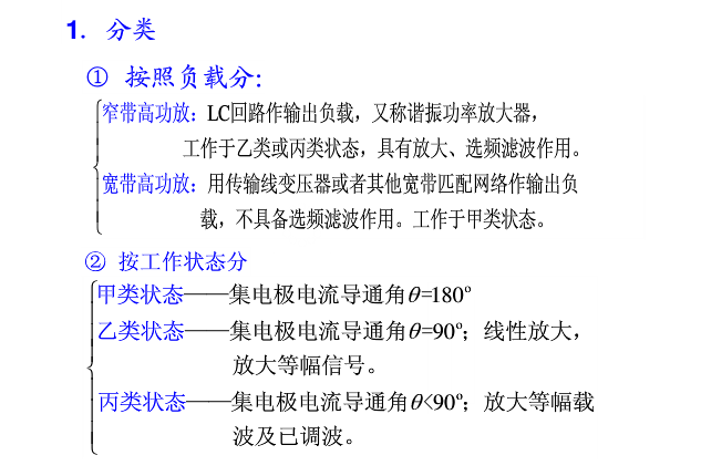 · 丙 类:Θ<90°,小于半个周期内,放大器集电极电流导通。