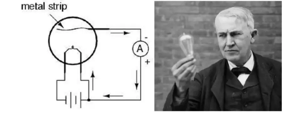 这一去又是数年,在1883年的一次常规试验中,小爱在碳丝附近安装了一截铜丝试图阻止碳“蒸发”,可惜又是一次“成功之母”。但是他却发现一个现象:碳丝加热后,铜线上存在微弱的电流,二者之间却没有任何连接?WHY?