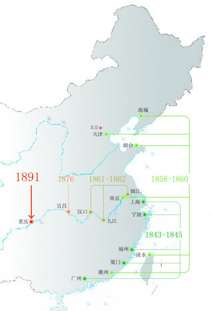 2.1842年,中国开始了“开埠”时代。最早开埠的是沿海各城,由南而北,自台湾、潮州、福州,一路北上至宁波、上海、天津等地。与沿海这条线相应,但时间稍微滞后的,是沿江(长江)一线。但与沿海各城开埠时间间隔不远不同,长江沿线各个城市的开埠时间相差颇大:长江中下游的镇江、南京、九江、汉口几个城市,在前后两年内先后开埠,但是位于长江上游和中游衔接处的宜昌,却比中下游城市的开埠时间至少晚了15年。而从宜昌到重庆,又用了15年——这个时间,距离沿海第一批城市开埠的时间,已经晚了将近半个世纪。