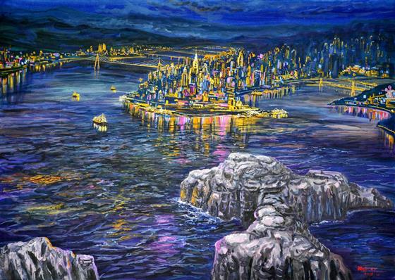 以下是王尔鉴为巴渝十二景的诗和重庆本土画家侯云所作的巴渝十二景的新国画。请试着将诗歌翻译成英文,并用英文描述此画。