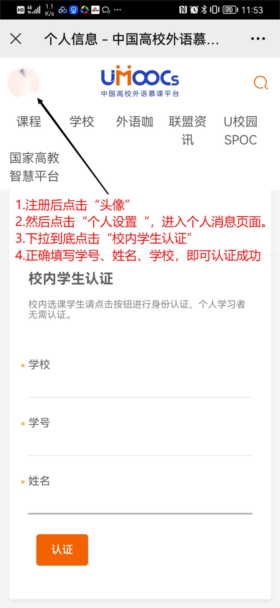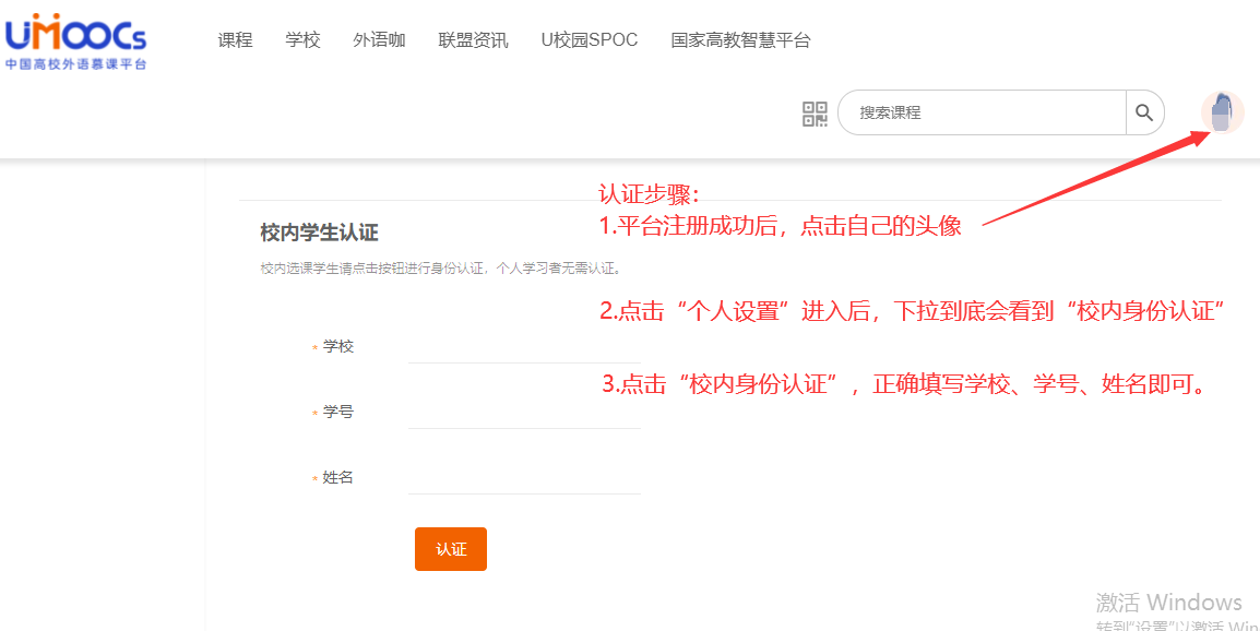 3.为了期末能够顺利导出你对成绩,请务必进行“身份认证”。(请在3月10日后进行认证,目前还需要中国高校外语慕课平台的负责人把大家信息导入后才可以开始身份认证,大家可以加入课程先学习)