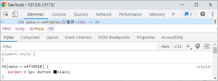 打开开发者工具,切换到Elements面板,查看父组件的h5元素的代码,如下图所示。