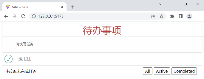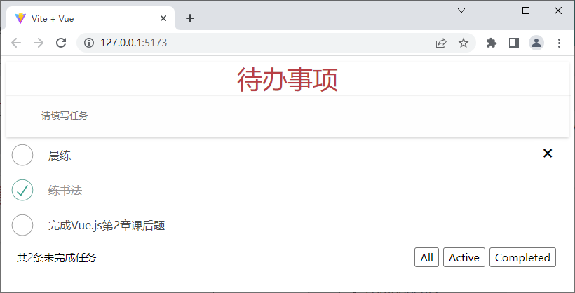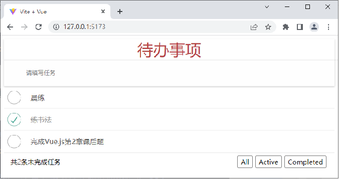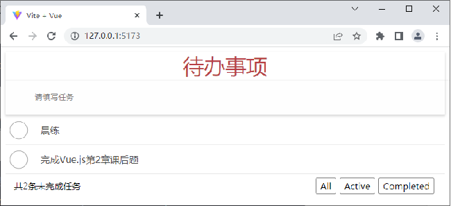 在文本框中输入内容后,在键盘上按下回车键,即可添加任务到待办列表中,添加“完成Vue.js第2章课后题”任务后的页面效果如下图所示。