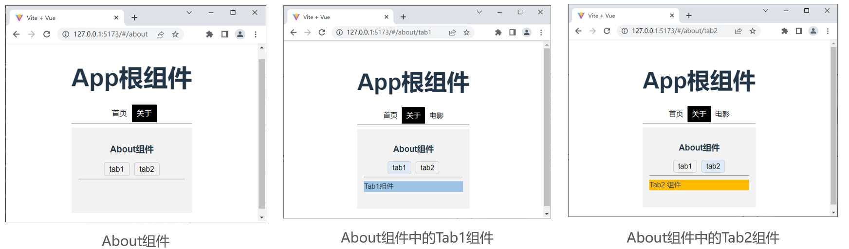 在浏览器中访问http://127.0.0.1:5173/。页面打开后,会自动重定向到About组件的路由,页面显示About组件;单击“tab1”链接,页面显示About组件中的Tab1组件;单击“tab2”链接,页面显示About组件中的Tab2组件,如下图所示。