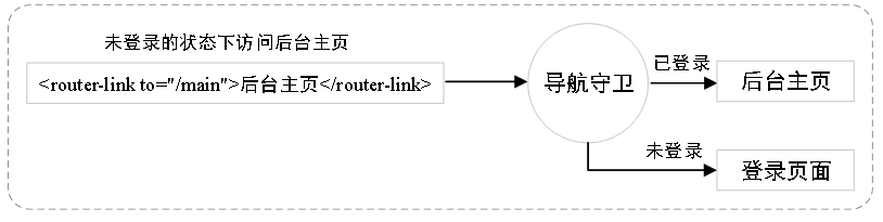 导航守卫用于控制路由的访问权限。例如,访问后台主页时,需要用户处于已登录状态,如果没有登录,则跳转到登录页面。用户在登录页面进行登录操作,若登录成功,则跳转到后台主页;若登录失败,则返回登录页面。