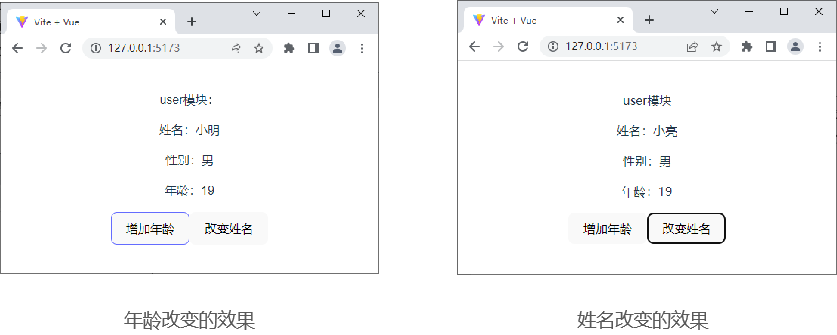 单击“增加年龄”按钮,年龄从18变为19;单击“改变姓名”按钮,姓名会从“小明”变为“小亮”,年龄改变的效果、姓名改变的效果如下图所示。