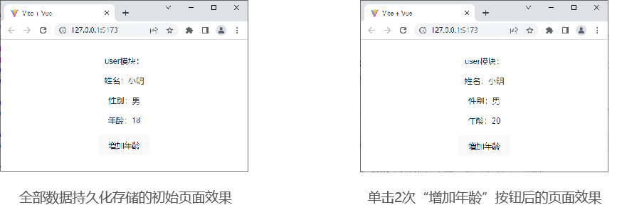 单击2次“增加年龄”按钮后,会发现年龄值变为了20,此时刷新页面后,年龄值仍为20,表明已实现数据的持久化存储。