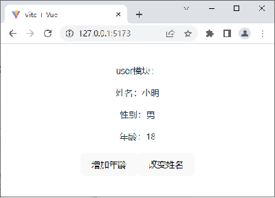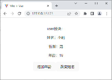(3)在src\components\User.vue文件中找到“增加年龄”按钮,在该按钮下方增加一个“改变姓名”按钮。
