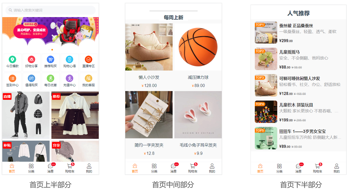 商品信息展示区:展示各种商品信息,例如每周上新的商品、热销商品等。