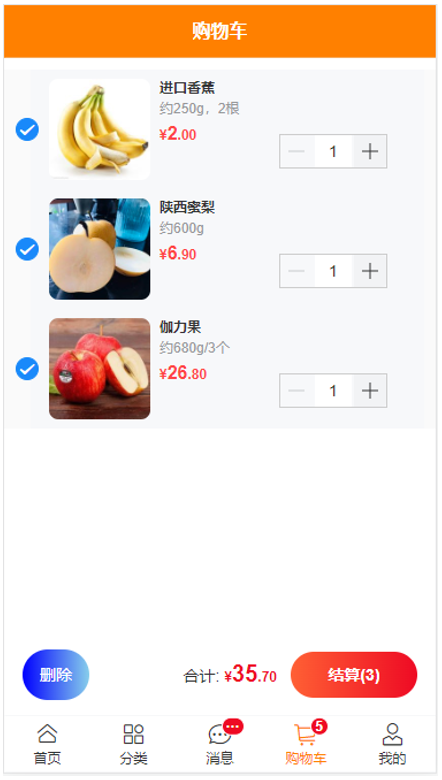 “微商城”前台网站主要以适配移动设备的页面效果为主,可使用Chrome浏览器的开发者工具,测试页面在移动端模拟环境下的页面效果。“微商城”网站采用Vant组件库结合Vue 3实现,主要包括“首页”“分类”“商品详情”“消息”“购物车”“我的”等页面。下面将对这些页面分别进行展示。