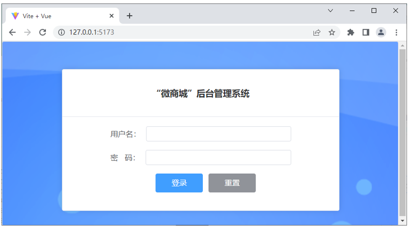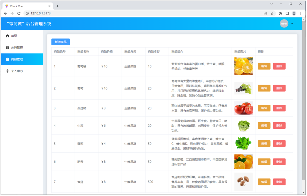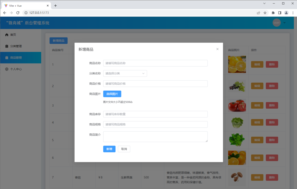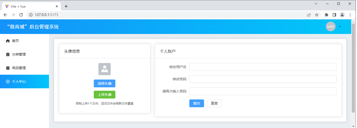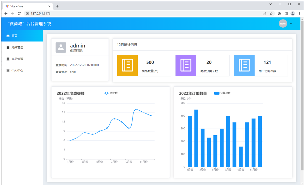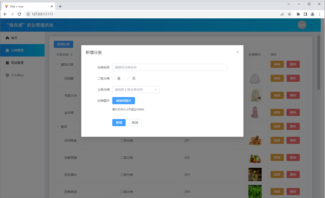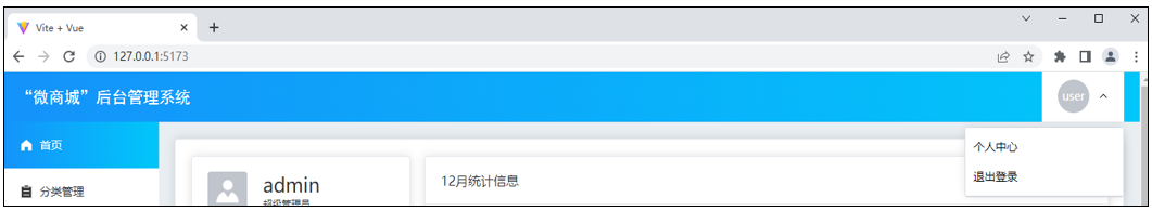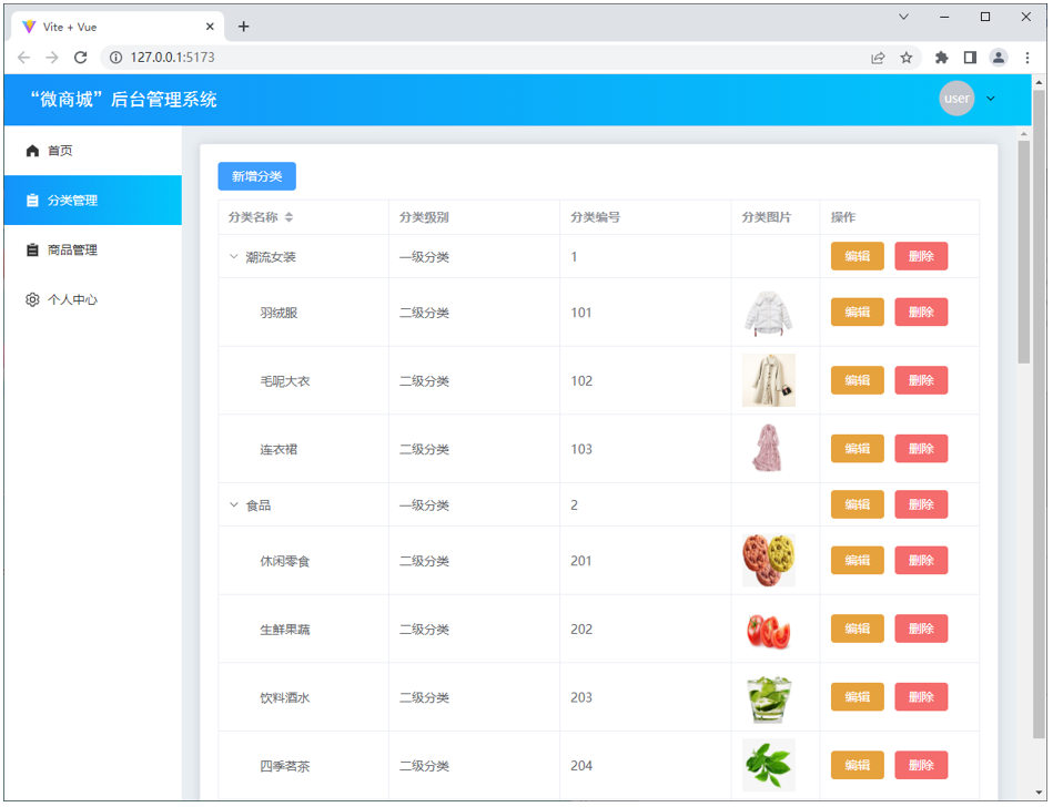“微商城”后台管理系统中主要包含登录页、首页、分类管理页、商品管理页、个人中心页,接下来分别对这些页面进行展示。