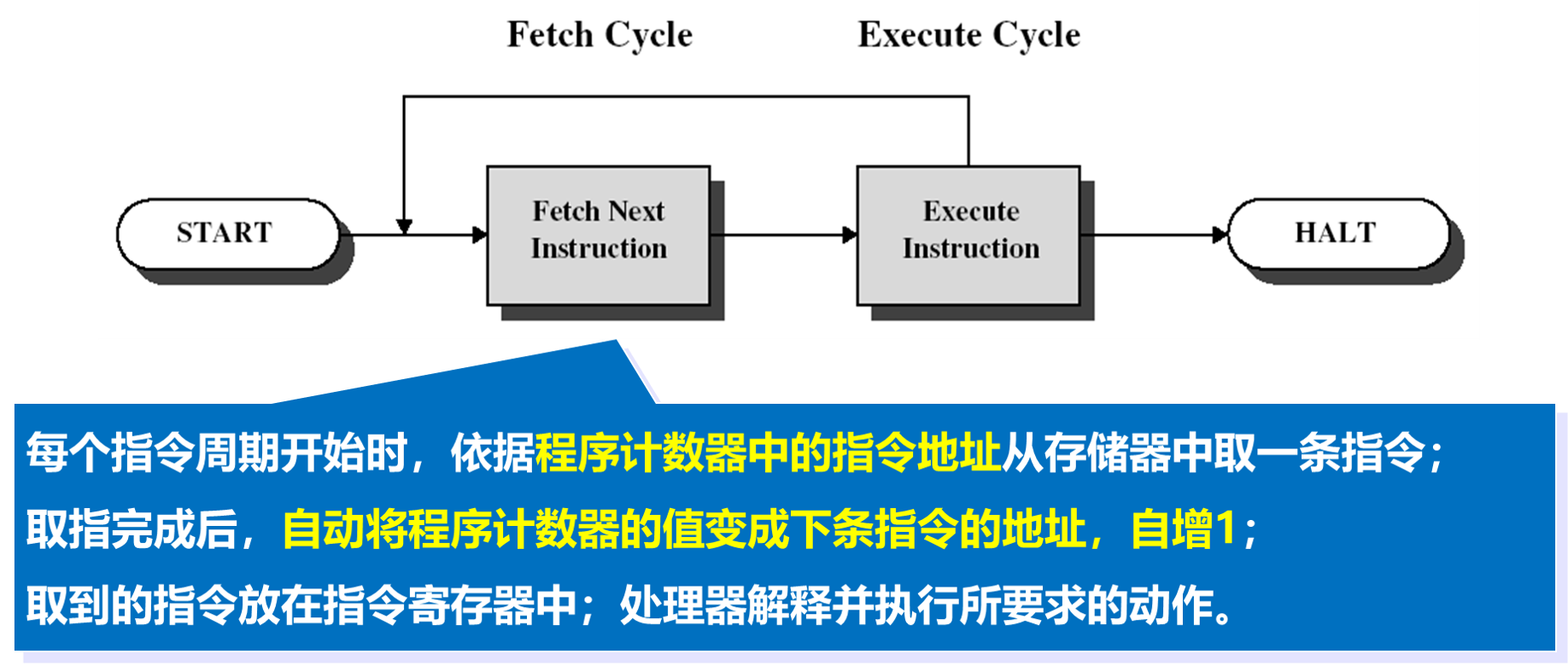 中央处理器(CPU)是系统的核心,负责指令的解释执行,以及过程的推进。CPU的运行机制如下图。