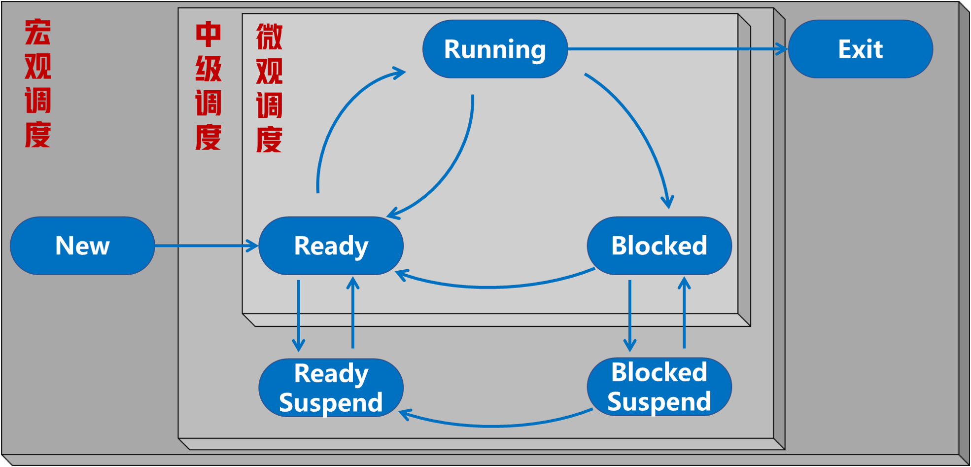 (3) 微观调度:即进程调度。从CPU资源的角度,执行的单位。时间上通常是毫秒。因为执行频繁,要求在实现时达到高效率。