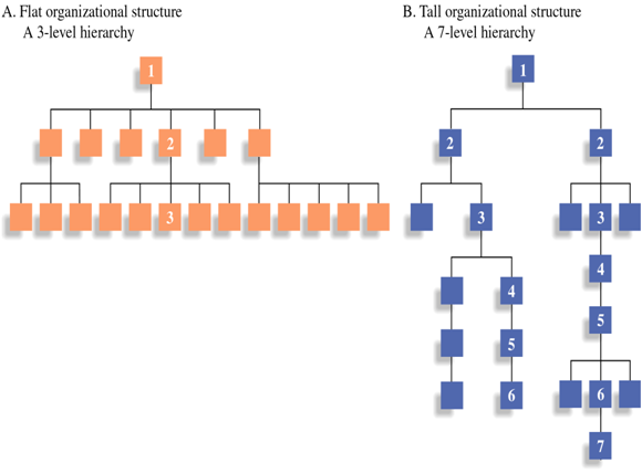 管理层次与管理宽度之间存在反比例的关系。较大的宽度意味着较少的层次,较小的宽度意味着较多的层次。这样,按照管理宽度的大小及管理层次的多少,就可形成两种结构:扁平结构和直式结构。所谓扁平结构(flat structure),就是管理层次少而管理宽度大的结构;而直式结构(tall structure)的情况则相反。扁平结构与直式结构各有利弊。