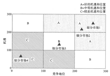我们根据各细分市场的得分,就可以确定每个细分市场在决策方格图中所处的位置。从图3-14中可以看到,各细分市场分别落在了图中的不同区域内。细分市场1和细分市场2落在了A区域内,表明此市场现在或未来有很好的机会,且酒店在这个市场中竞争优势明显;细分市场3落在了B区域内,表示此市场有中等的机会和优势;细分市场4落在左下方C区域内,表明此市场的机会很一般,且酒店在这些细分市场内并没有明显的优势。