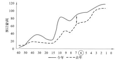 从图5-3中可以看到,预测日前6天,去年同期卖出了65间房,而当天此时已经卖出了90间房,同比变化率为38.5%。从图中还可以发现,从预测日提前50天起,今年酒店客房的销售量就开始超过去年同期,并且稳步提升,在这样的趋势下,我们基本上可以判断今年预测日的客房市场需求一定会大于去年同期。当该酒店预订进度预测结果较好,高于历史同期时,酒店可以适当提高价格,设置严格的价格限制条件,将客房售卖给高价值的细分市场,从而提升酒店的整体收益。