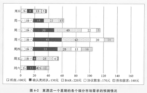 图6-2是某酒店一个星期的各个细分市场需求的预测情况,酒店共有客房100 间,这是一个典型的无限制的市场需求预测。在图的下方可以看到各个细分市场 的价格,那么在这7天中,酒店每一天最后一间客房的价格应是多少呢?