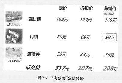 某星级酒店有自助餐、月饼、游泳券三项产品,原价分别为169元、89元和59元,三项产品总成交价为317元。假设现在有以下两种定价策略可以选择:第一种策略是各项产品分别以109元、69元和29元的折扣价格吸引消费者购买,三项产品打折后的总额为207元;第二种价格策略是,酒店在线上平台开展满300元减99元的满减活动,购买自助餐、月饼和游泳券单项产品的价格分别为169元、99元、39元,如果同时购买3项产品客人实际只需要支付208元,相当于买自助餐和游泳券送月饼(图7-4)。