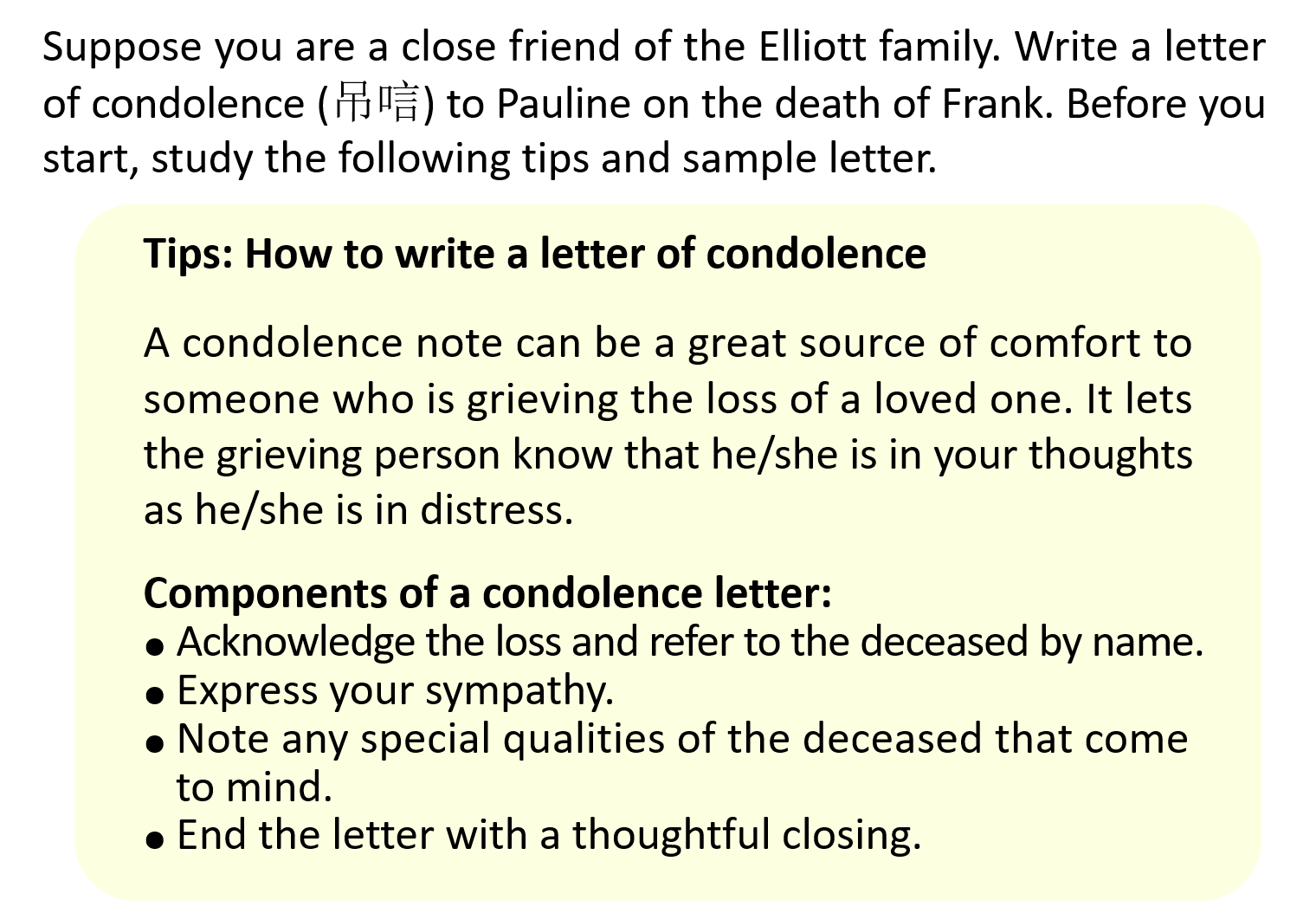 Suppose you are a close friend of the Elliott family. Write a letter of condolence (吊唁) to Pauline on the death of Frank. Before you start, study the following tips and sample letter.