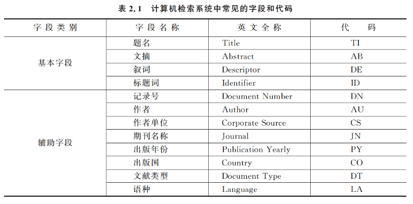 字段限制检索是指限定检索词在数据库记录中的一个或几个字段范围内查找的一种检索方法。在检索系统中,数据库设置的可供检索的字段通常有两种:表达文献主题内容特征的基本字段和表达文献外部特征的辅助字段。不同的检索系统设定的字段会有不同,常见的字段及代码如表2.1所示。