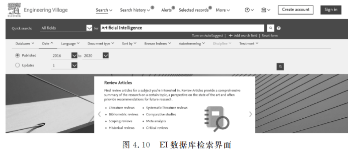 (4)在检索限定中,除检索时间限定在2016—2020年外,其他三种限定方式选择系统默认状态,即只设置Limit to下方的年份。如图4.10所示为EI数据库检索界面。