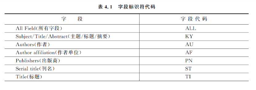 高级检索界面与快速检索界面唯一的区别是检索窗口,高级检索界面中只有一个检索条件文本框。在此文本框中输入的检索词可以遵照一定的规则进行更灵活、更准确的组配构成比较复杂的检索式。用户可以使用各种检索算符与字段标识符组合,对检索字段进行限制;可以使用逻辑运算符、括号、位置算符、截词符和词根算符等对检索词进行各种运算。因此,采用高级检索方式一方面大大提高了检索的灵活性和准确性,但另一方面也对用户提出了更高的要求,需要用户比较熟练地掌握系统的检索语言(规则)。此外,该方式下系统将严格地按输入的检索式进行检索,不自动进行词根运算。因此,同一检索式在高级检索方式下和快速检索方式下得到的检索结果有可能不同。因为在快速检索方式下,系统默认启用词根运算。如表4.1所示为字段标识符代码。