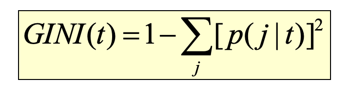 是结点t中属于类别j的训练实例(数据对象)的相对频率。当结点里的实例在类别标签上呈现均等分布时,基尼系数取得最大值,代表“纯度”最低。相反,当结点里的实例只有一个类别标签时,基尼系数取得最小值,代表“纯度”最高。