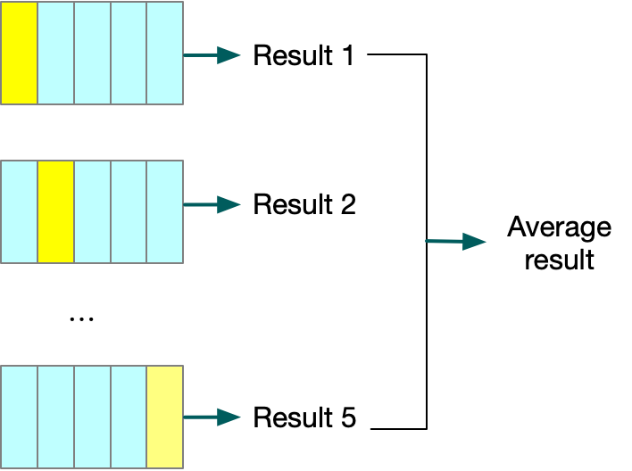 交叉验证法,它有效的利用标记的集合中所有的标记实例进行训练和测试。第一步,由于交叉验证又被称为k折交叉验证,所以首先需要选择k的大小。一般来讲,k通常为5或者10;第二步,将标记数据集划分为k个相等大小的分区;第三步,选择一个分区作为测试集,其他的k-1个分区作为训练集;第四步,使用训练集训练分类模型;第五步,使用测试集验证模型的性能;第六步,保存测试结果;第七步,重复第三步到第六步k次;第八步,将结果进行平均处理作为最后的结果。如下 图suo示,是一个5折交叉验证方法的示意图。