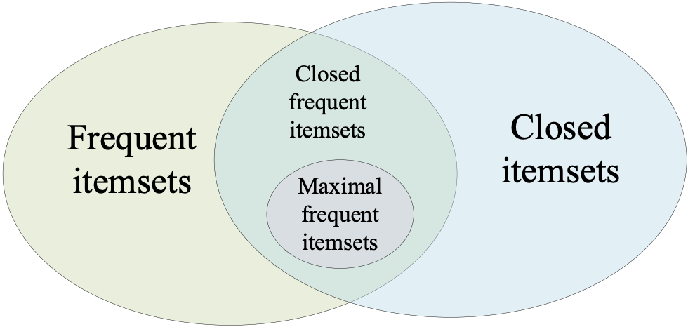 频繁项集、闭项集、闭频繁项集和极大频繁项集之间的关系,如下图所示。