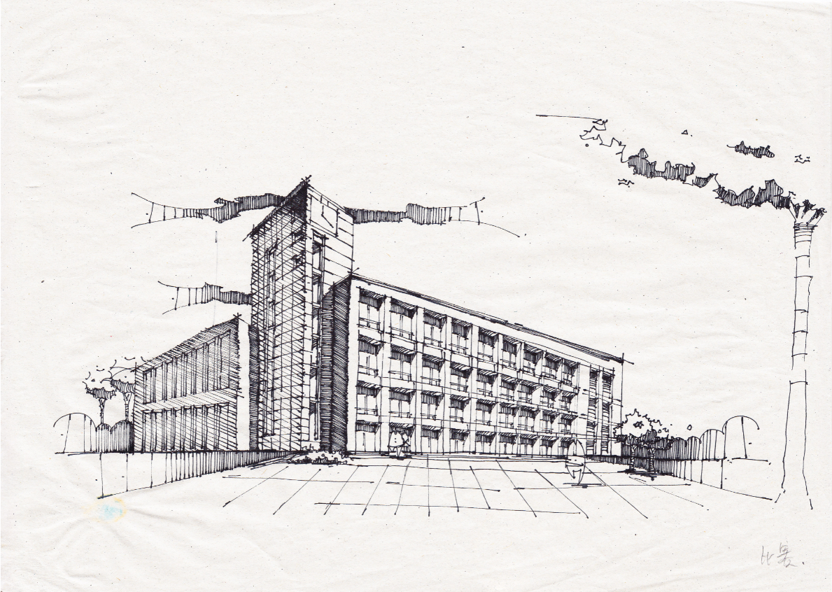 运用成角透视绘画时需要注意的是:一,两个消失点之间的距离要比画幅宽,否则会导致形体的观感产生畸变;二,其中一个消失点可以距离画幅很近甚至进入画幅,但另一个则应更加远离。这是根据形体的面与视平面所成角度而决定的。形体的面与视平面所成夹角越大,消失点距离心点就越近,反之亦然;三,消失点距离心点越近,形体面的可见面积就越窄小,反之则宽大。(图4-21 现代建筑2-吕鑫源)