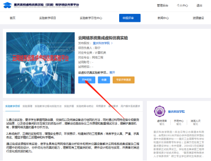 2.注册账号后,选中“云网络系统集成虚拟仿真实验”项目页面,如下图所示,点击“开始实验”按钮,即可进入平台进行实验。