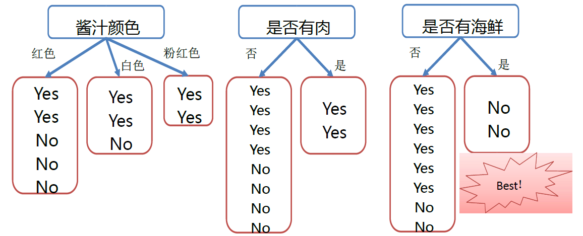 – 如果一个属性执行后,使得数据集上的信息增益最大(最有序),则该属性应该优先被执行(更接近根节点)。
