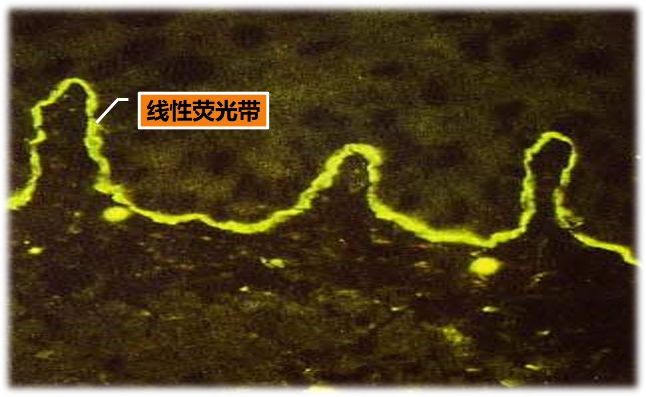 免疫荧光:上皮基底膜部位有免疫球蛋白沉积,呈绿色荧光带(图11.3-6),为抗基底膜抗体阳性,是本病特异性诊断标志。