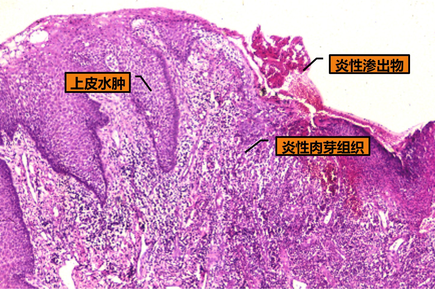 上皮水肿,细胞间有白细胞,以后形成溃疡;溃疡表面形成假膜;溃疡部位以中性粒细胞和淋巴细胞浸润为主(图11.3-8)。