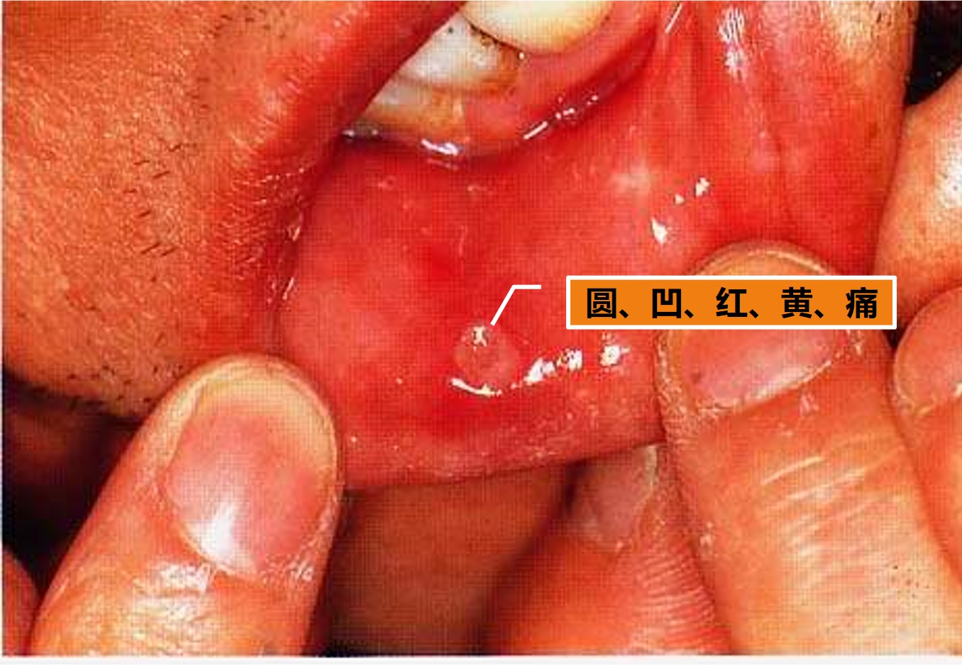 圆形或椭圆形溃疡,直径小于1cm,中央凹陷,周围有清楚的红晕,表面覆盖黄白色假膜,疼痛明显(圆、凹、红、黄、痛)(图11.3-7)。