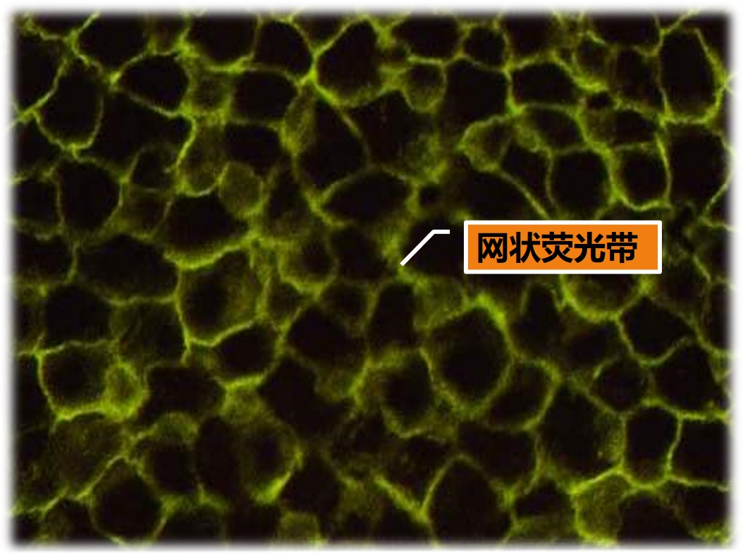 免疫荧光:上皮棘细胞层呈翠绿色的网状荧光图形,主要为IgG在棘细胞间沉积。