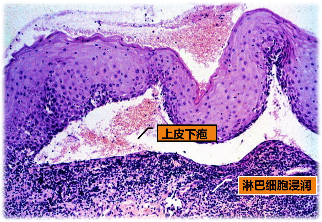 上皮全层剥脱形成基底层下疱,固有层内大量淋巴细胞浸润(图11.3-5);上皮剥脱后结缔组织表面无残留的基底细胞层,且上皮内无棘层松解(区别与寻常性天疱疹)。