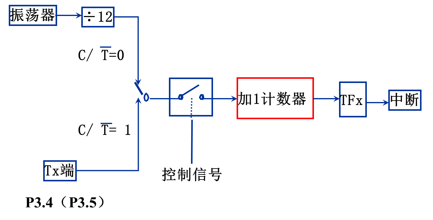 定时工作时,8051 片内振荡器输出经 12 分频后的脉冲,即每个机器周期使定时器(T0 或 T1)的数值加 1 直至计满溢出。 计数工作时,通过引脚 T0(P3.4)和 T1(P3.5) 对外部脉冲信号计数。