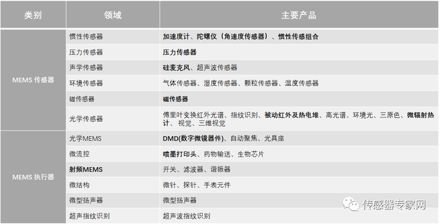 MEMS传感器就是把一颗MEMS芯片和一颗专用集成电路芯片(ASIC芯片)封装在一块后形成的器件。常见的MEMS器件产品包括MEMS加速度计、MEMS麦克风、微马达、微泵、微振子、MEMS光学传感器、MEMS压力传感器、MEMS陀螺仪、MEMS湿度传感器、MEMS气体传感器等等以及它们的集成产品。